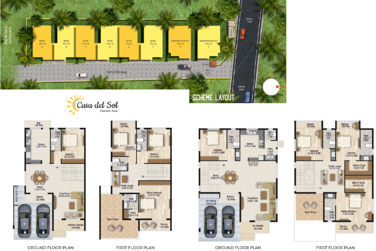 The layout of Casa del Sol is thoughtfully planned with a row of Row Villas and Independent Villas lined along a wide internal driveway. Each home has its own parking space and a small green patch in front. The entire scheme is surrounded by greenery and palm trees, giving a peaceful, nature-friendly environment. It’s designed to provide comfort, easy movement, and a beautiful setting for everyday living.